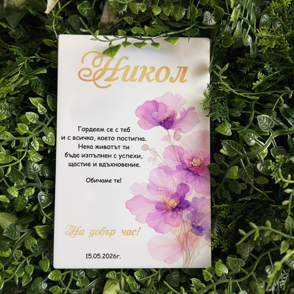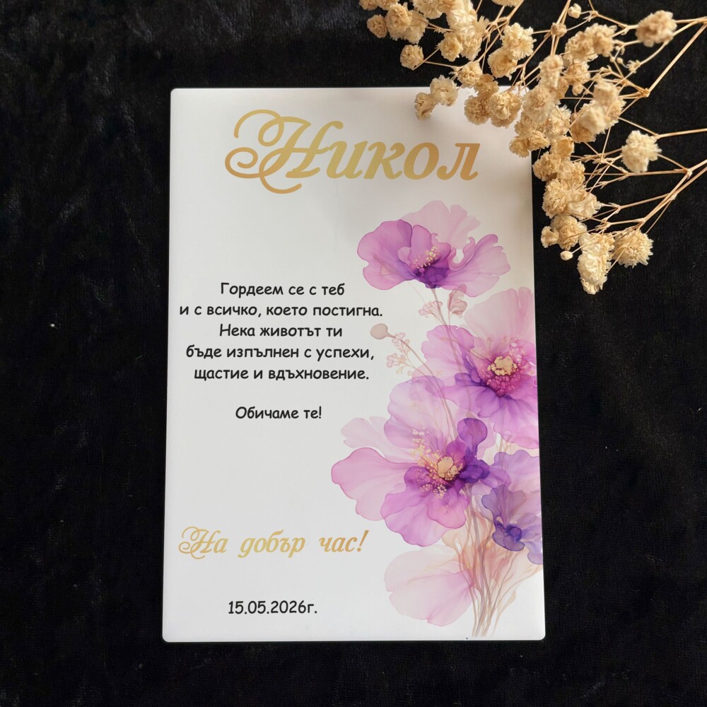 Изработена от висококачествен бял акрил, картичката впечатлява с модерен дизайн и луксозно излъчване. Декорацията е реализирана чрез прецизен UV печат, който гарантира наситени цветове и дълготрайност, а акцентите от златно огледално фолио придават блясък и елегантност.