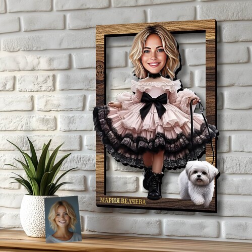 Персонализирана карикатура на жена с кученце, изработена по ваша снимка.
