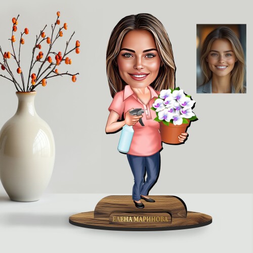 Персонализирана карикатура на жена любител на цветята, изработена по ваша снимка.