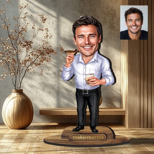 3Д дървен плакет - Карикатура Мъж с пура и питие