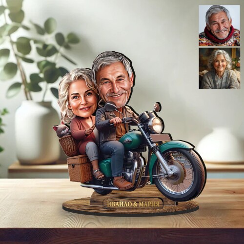 3Д дървен плакет - Карикатура на двойка на ретро мотор с кош и коте - пътешествие