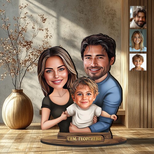 3Д дървен плакет - Карикатура на семейство с едно дете - момче
