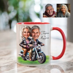 Чаша с карикатура на мъж и жена - двойка на ретро мотор