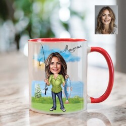 Чаша с карикатура на жена с въдица и риба - рибарка