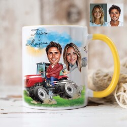 Чаша с карикатура на мъж и жена с трактор - земеделци