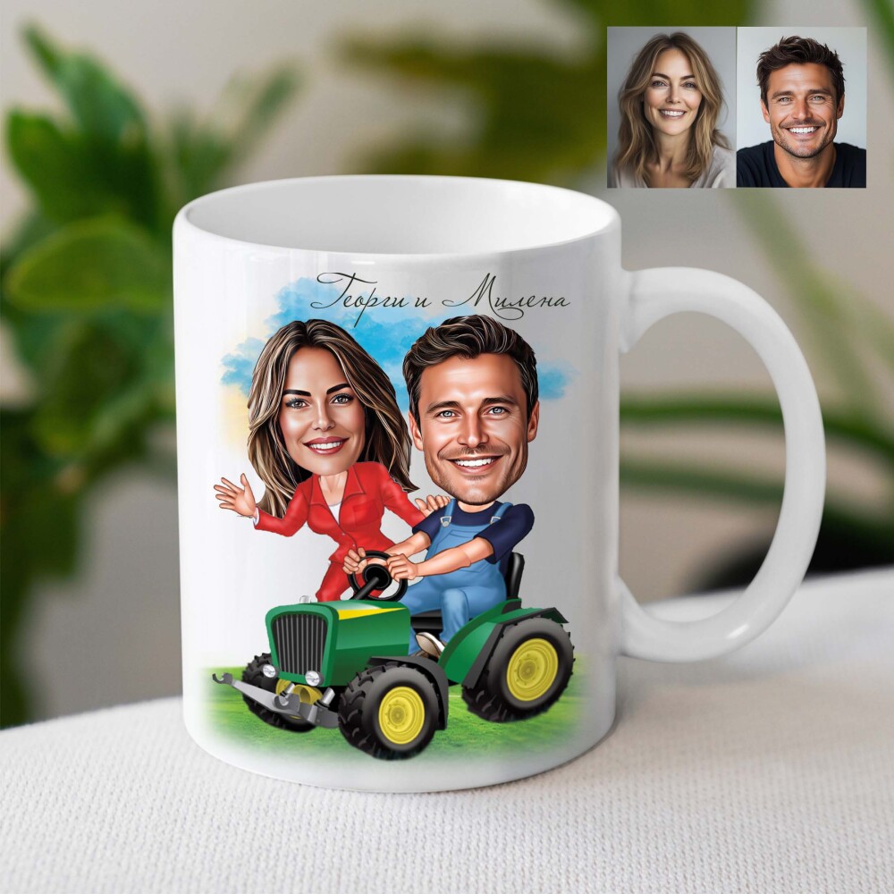 Чаша с карикатура на мъж и жена с трактор - земеделци